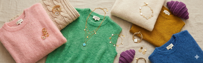 Maelle : Je suis amoureuse de nos nouvelles puces d'oreilles avec des petites pierres colorées. C'est l'astuce ultime : si tu hésites entre or et argent, prends un bijou avec une pierre de couleur (vert émeraude, bleu profond...). C'est elle qui attirera l'œil. Et pour celles qui ne veulent vraiment pas choisir... nos bagues bi-matières sont parties pour être le best-seller du mois !